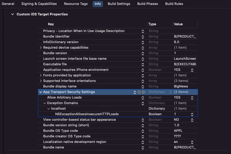 - Info.plist 파일에서 NSAllowsArbitraryLoads 를 직접 코드를 추가하거나, xcode 에서 항목을 추가하여 해결