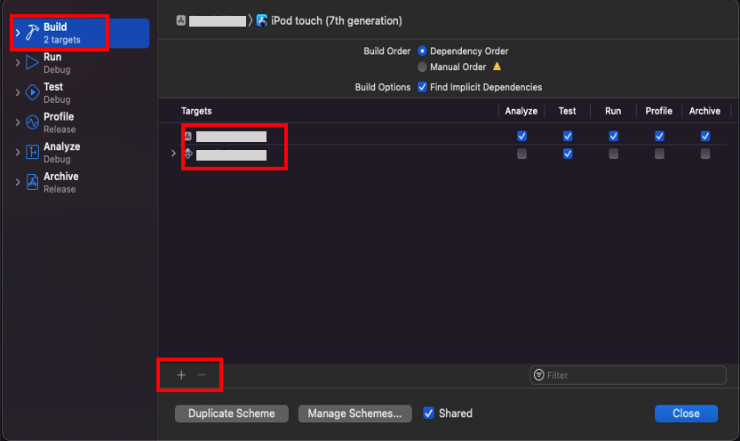 1) schema 수정 시 Manage Scheme 에서 변경한 후, [Project > Scheme > Edit Scheme] 에서 Build 단계에 존재하는 기존 Targets 을 삭제한 후 새로운 Targets을 등록 ( 기존 Target 이름에는 miss 가 기재되어있음)
