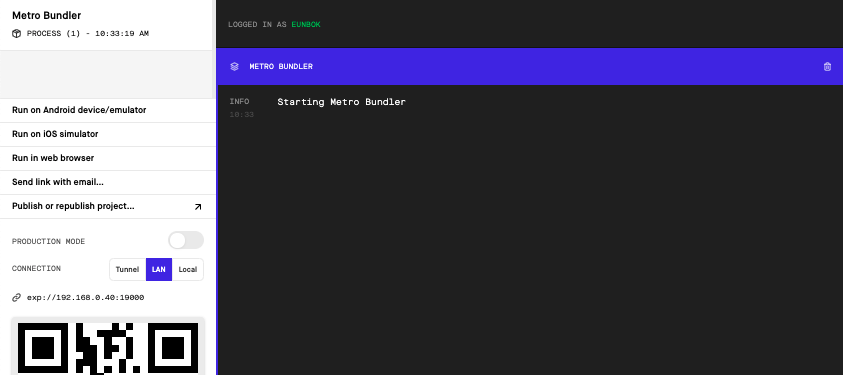 * 위와 같이 Metro bundle이 자동으로 실행되고, 실제 휴대폰에서 실행할려면 QR code를 스캔하면 되지만,
