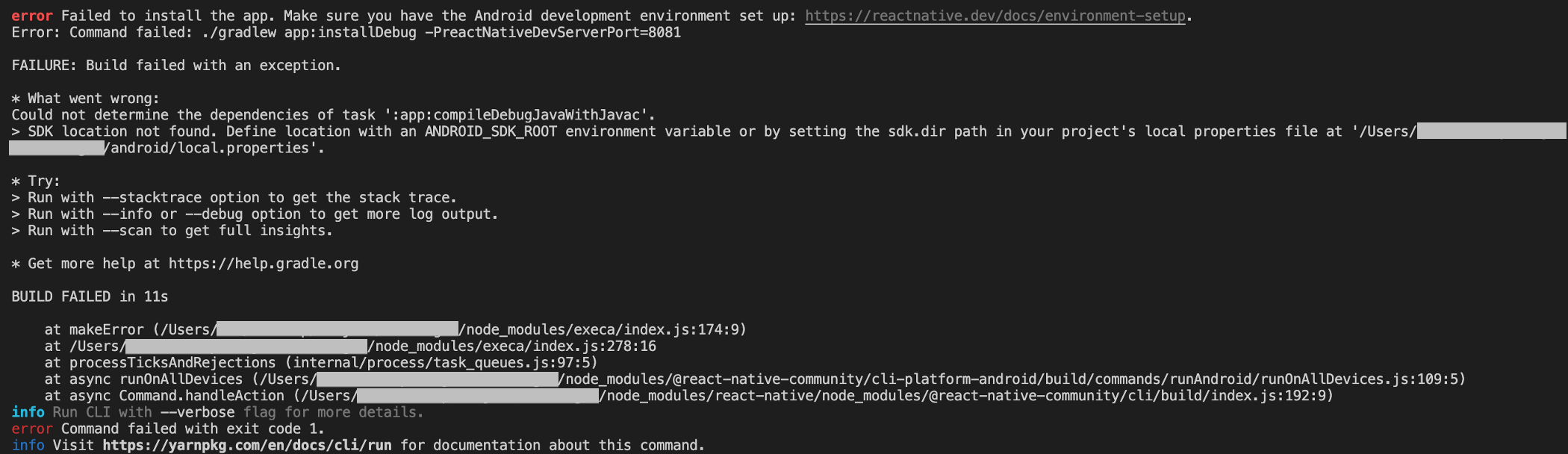 error Failed to install the app. Make sure you have the Android development environment set up: https://reactnative.dev/docs/environment-setup.