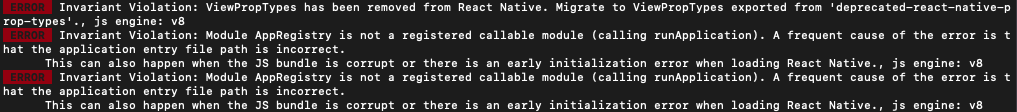 ERROR Invariant Violation: Module AppRegistry is not a registered callable module (calling runApplication). A frequent cause of the error is that the application entry file path is incorrect. This can also happen when the JS bundle is corrupt or there is an early initialization error when loading React Native., js engine: v8