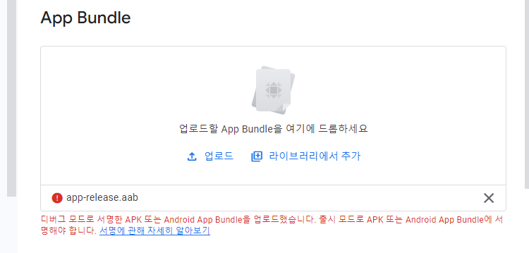 만약, 업로드 시 아래와 같이 디버그 모드로 서명한 APK 라고 경고가 발생하면, 아래 부분을 살펴보자.
