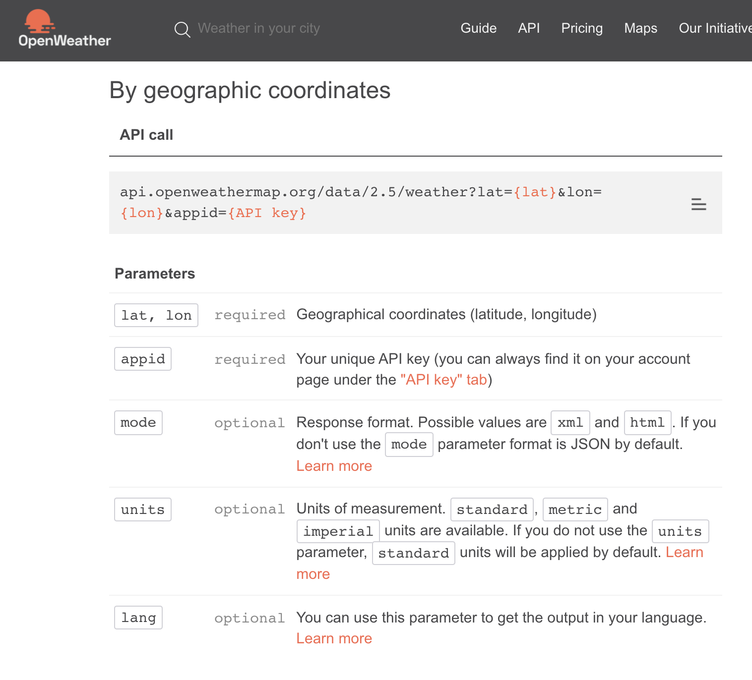 * [Home > API > Current Weather Data] 확인 시, 좌표값으로 날씨 정보를 읽어 올 수 있는 규격 있음