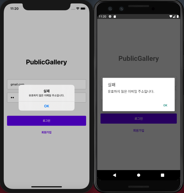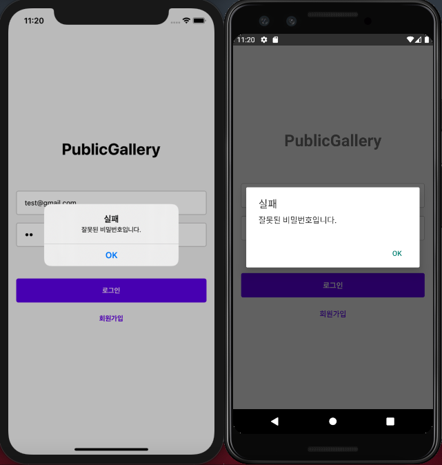 Alert.alert('실패', '비밀번호가 일치하지 않습니다.');