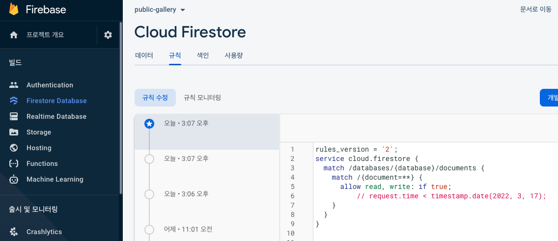 이 경우 Cloud Firestore의 규칙 탭에서 아래와 같이 규칙을 수정한 뒤 게시하면 됨