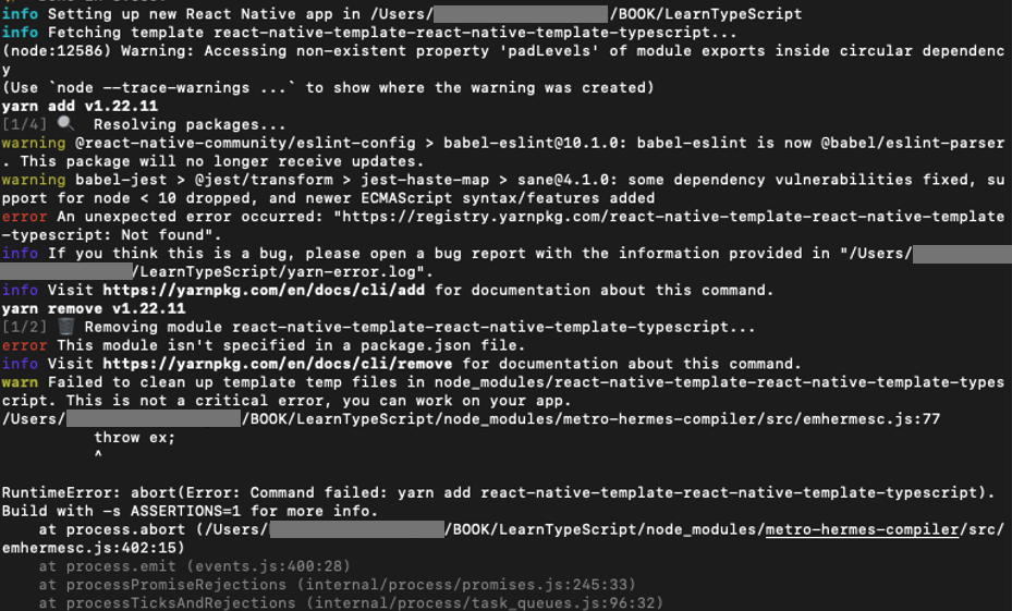 error This module isn't specified in a package.json file. info Visit https://yarnpkg.com/en/docs/cli/remove for documentation about this command. warn Failed to clean up template temp files in node_modules/react-native-template-react-native-template-typescript. This is not a critical error, you can work on your app.