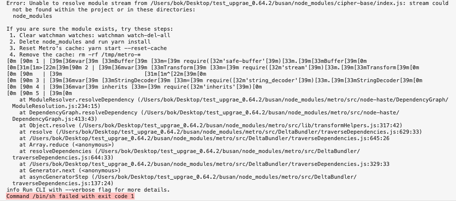 reat native 0.63.4 버전이 stream 패키지를 가져오지 못해서 발생한 이슈라고 함
