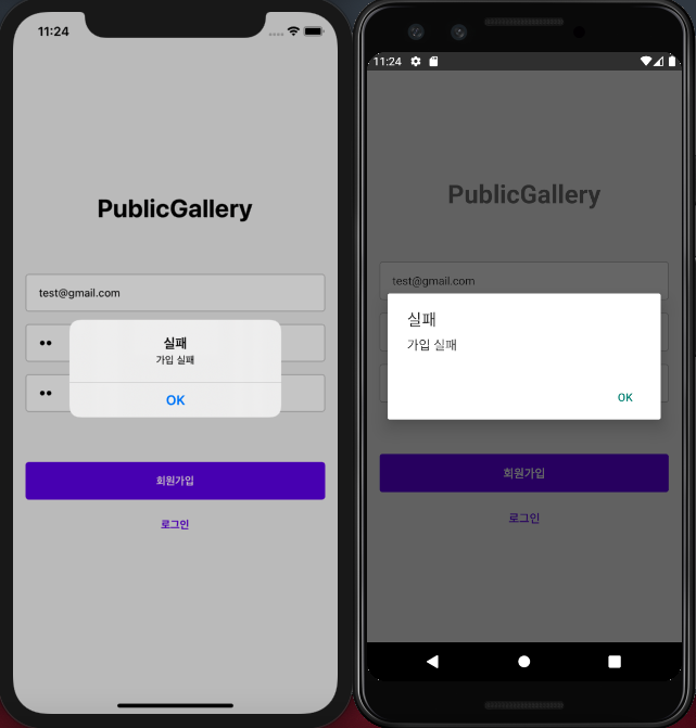 Alert.alert('실패', '비밀번호가 일치하지 않습니다.');