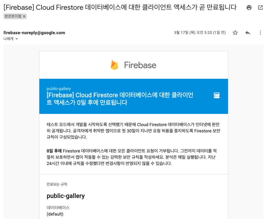 문득 책에서 firebase databse 를 만들고 30일이 지난 뒤 권한이 종료된다는 내용이 생각나서 이메일을 확인함