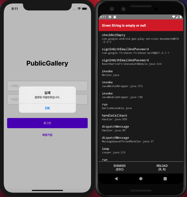 * Firebase 의 auth() 를 사용하여 인증을 요청할 때, email 과 password 값을 빈 값으로 호출 시 android 에서만 에러 발생
